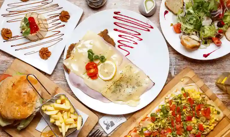 2 cafe cortado, espresso o mocka, 2 sandwich jamón palta, 4 medias lunas + 1 porción de torta 4 leches + litro de jugo.