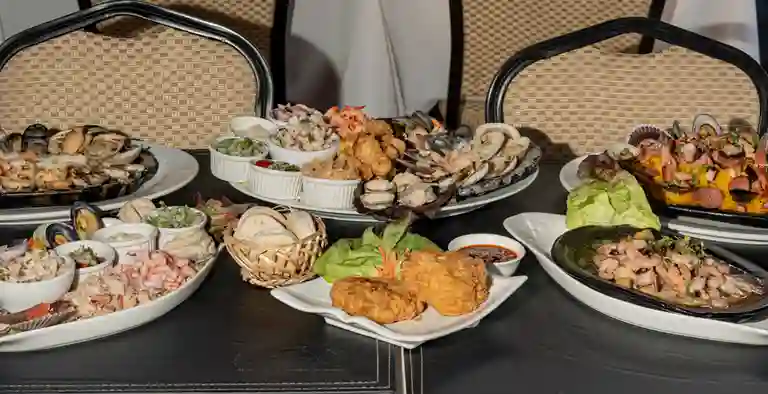Salsa verde, loco, machas, ostión, camarón y piensas de jaiba