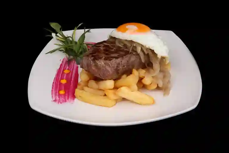 Lomo a la plancha acompañado de papas fritas caseras, cebolla caramelizada y dos huevos.