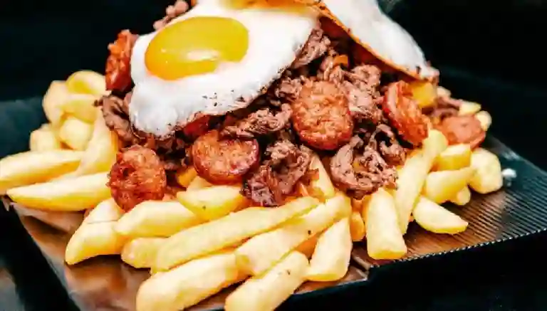 Chorrillana grande con vacuno, pollo, choricillo, cebolla, huevo frtiso, papas fritas y pan de molde.