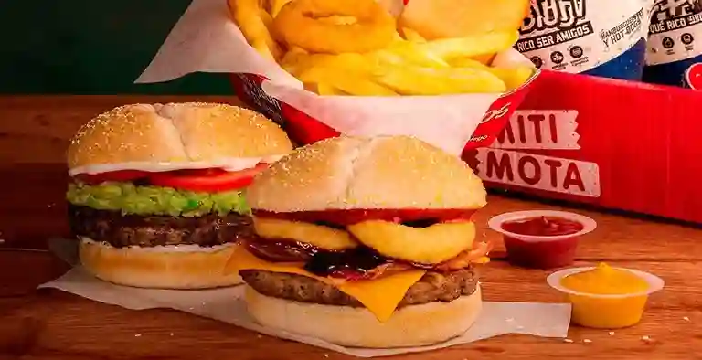 Hamburguesa doble carne a elección (campestre, criolla, italiana, vaquera y ganadera) + bebida 350 ml + papa frita mediana.