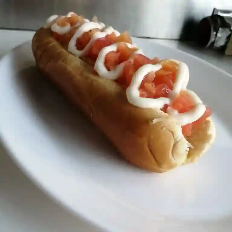Pan de 26 cm con vienesa grande con palta, tomate y mayonesa.