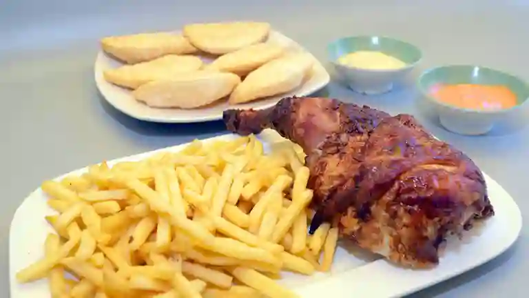 1/2 pollo, 400grs papas fritas, 3 empanadas de queso y salsas mayo ajo y mayo ciboulette