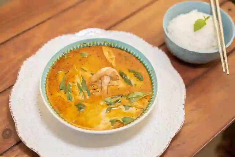 Un plato de picor medio, elaborado con leche de coco, textura suave y cremosa con berenjenas, albahaca, cebolla morada, acompañado de arroz blanco. Proteína a elegir.