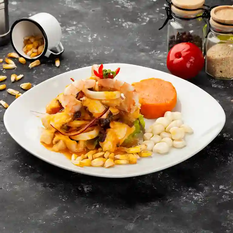 Camarones, pulpo, ostiones, calamar con un toque de coñac y salsa de ají amarillo