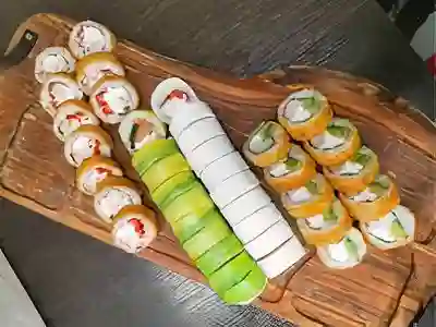 Salmón, cebollín y queso envuelto en palta (10). Camarón, morrón y queso envuelto en queso (10). Pollo, morrón y queso frito en tempura (10). Kanikama, palta y queso frito en tempura (10)