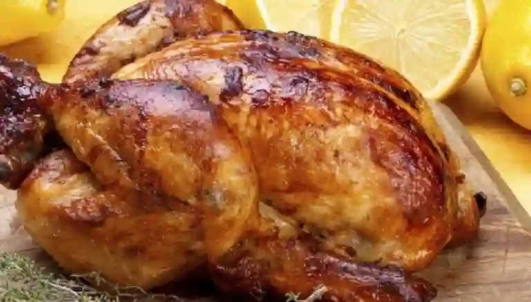Un pollo entero listo para llevar, sin acompañamientos ni guarniciones adicionales.