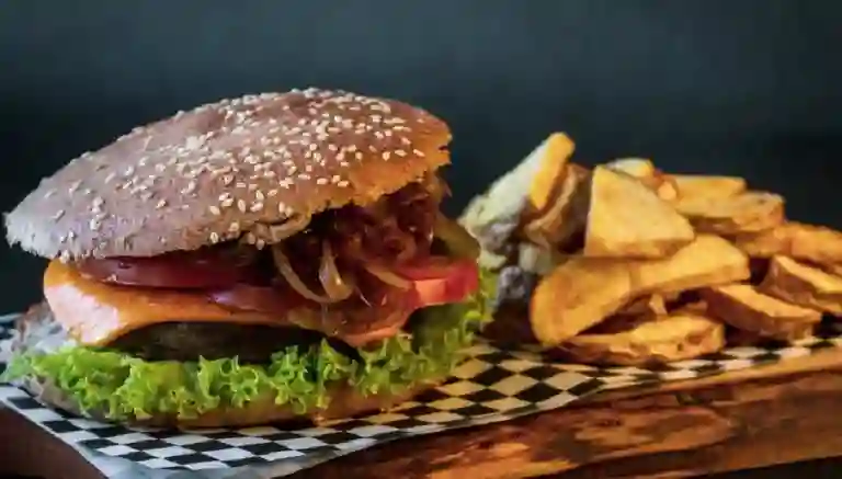 Cde legumbres estilo americana con queso vegano, pepinillos dill, cebolla morada, lechuga, salsa bbq y mayonesa vegana en pan integral de la casa, ración de papas fritas rústicas.
