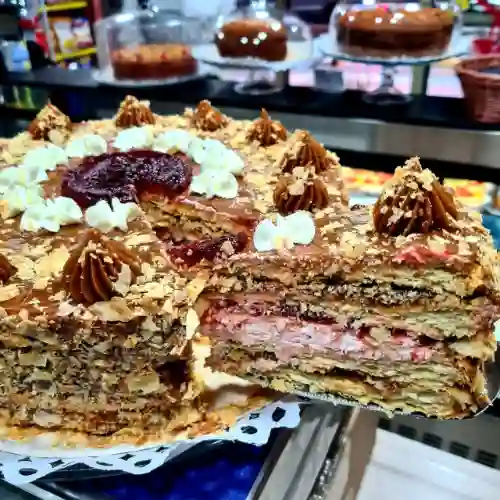 Bizcocho de vainilla húmedo de tres leches y relleno con crema pastelera y manjar.