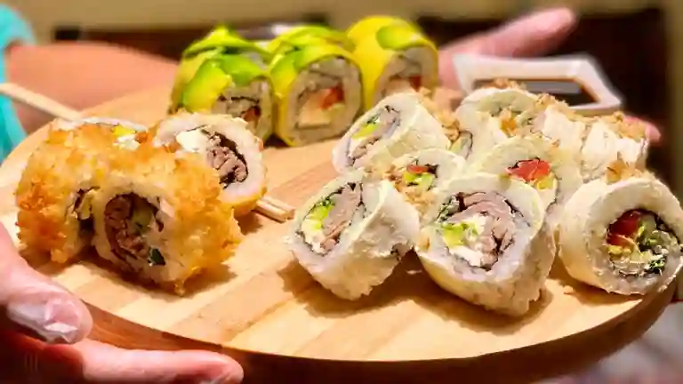 1 Rolls Pollo Marinado En Soya, Nuez, Queso Crema Envuelto En Sésamo + 1 Rolls Vegetariano, Palta, Ciboulette, Queso Crema, Pepino, Pimentón Envuelto En Sésamo + 1 Rolls De Camarón, Queso Crema, Pepino, Pimentón Envuelto En Queso Crema + 1 Rolls De Champiñón, Queso Crema, Palta, Ciboulette Envuelto En Palta + 1 Rolls Churrasco, Queso Crema, Palta, Cebollín Envuelto En Ciboulette + 1 Rolls De Kanimaka, Queso Crema, Palta, Cebollín Envuelto En Nori + 1 Rolls De Pollo Marinado En Soya, Queso Crema, Palta Cebollín Envuelto En Tempura + 1 Rolls De Kanimaka, Queso Crema, Palta, Cebollín Envuelto En Tempura.