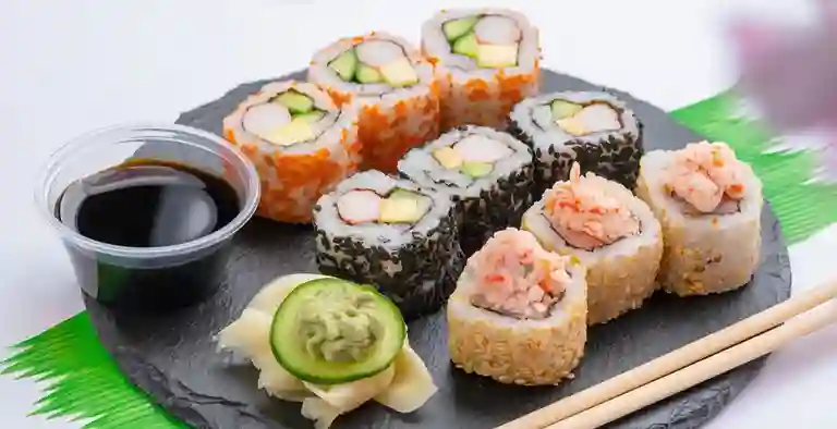 Completo de sushi con choclo, champiñones, palta, cebollín, queso crema, arroz y salsa fuji.