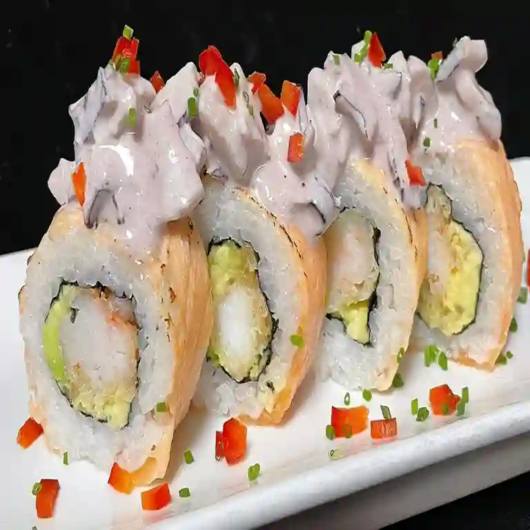 Relleno de camaron apanado, queso, palta, con cobertura de atun flameado, chalequita de verduras, bañado en salsa acevivhada, 10 pzas.