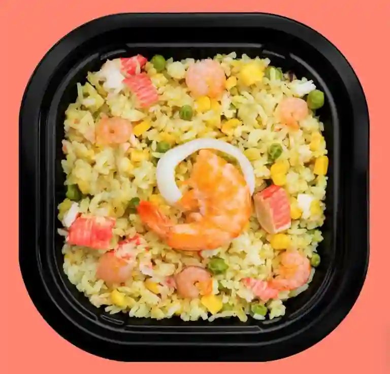 *listo para calentar 270g. Arroz al curry con camarones, calamares, kanikama, choritos y algunas verduras.