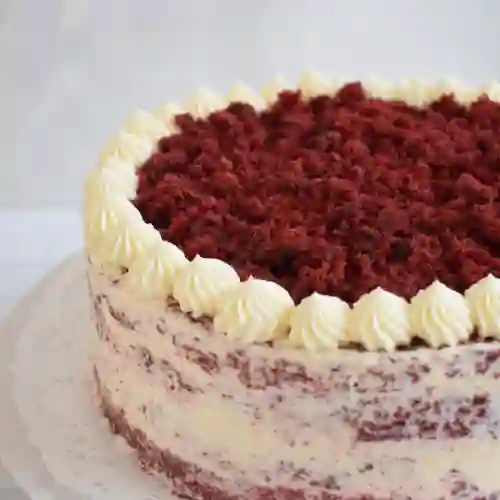 Húmedo y aterciopelado bizcocho rojo con toques de chocolate relleno con una capa de manjar y frostig de queso crema.