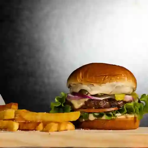 Hamburguesa de pan brioche, doble carne de 165gr de vacuno o pollo, queso cheddar, panceta crujiente y salsa bbq. acompañada de papas fritas.