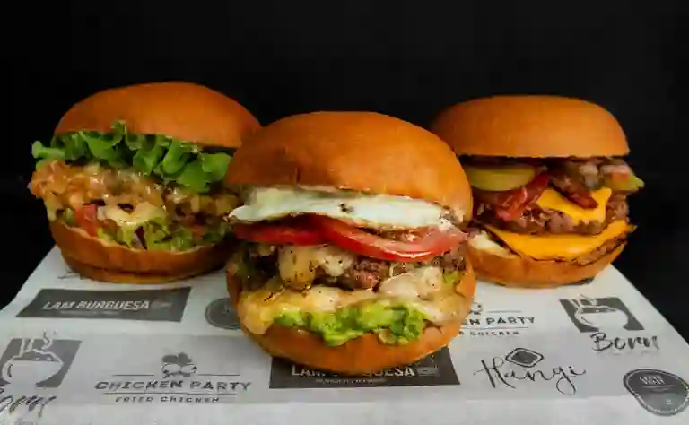Doble carne de 90grs tipo smash, queso mantecoso, mouse de palta, huevo frito, tomates y alioli, en pan de papa.