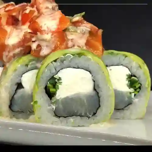 Roll relleno de salmón, camarón, queso crema, palta, cebollín, envuelto en palta, bañado de salsa acevichada con otra salsa a elegir, 10 piezas.
