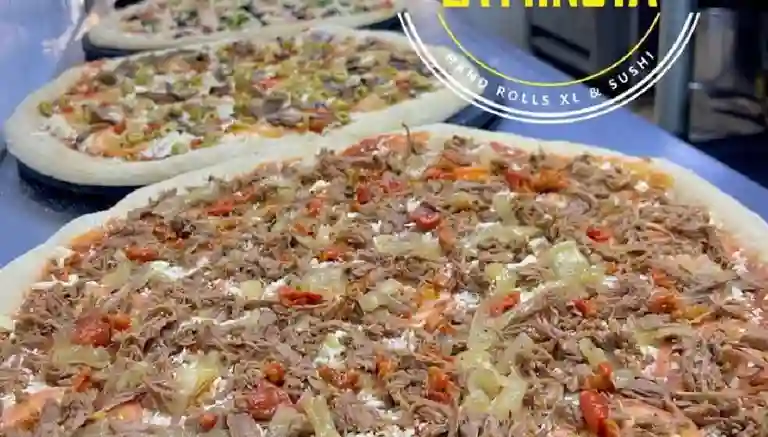 Pizza familiar mechada con salsa pomodoro de la casa, queso mozzarella, carne mechada, tomate fresco, cebolla caramelizada, pimentón rojo salteado y orégano.