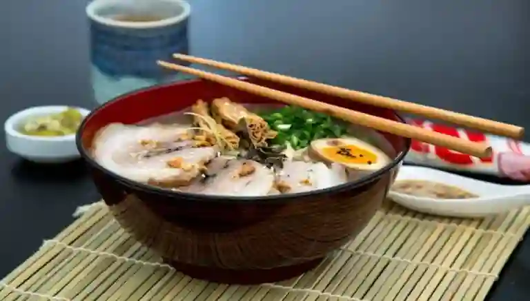caldo de cerdo, soya, panceta de cerdo, fideos, cebollin, huevo, narutomaki, espinaca.