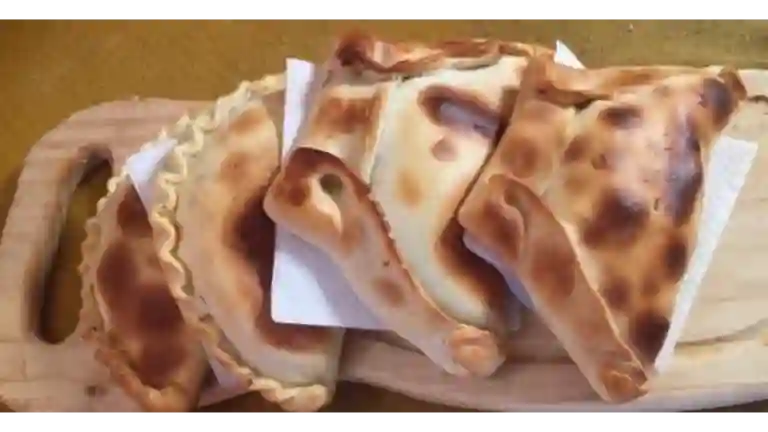 Empanada de pino con carne, cebolla y especias, acompañada de pebre.