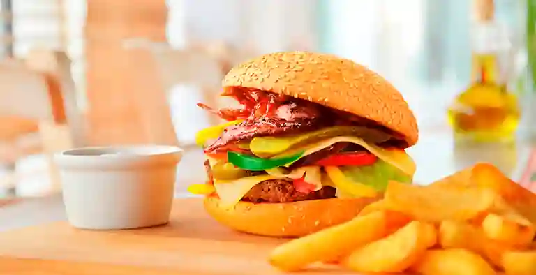 Sandwich de queso, tocino, champiñón y mayonesa en pan frica, incluye papas y bebida de 350 ml