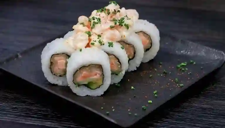 Rolls envuelto en palta, relleno de camarón, base queso crema, cebollín y cubierto por salsa acevichada, 9 pzas.