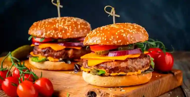Pan frica, proteína a elegir, queso cheddar, lechuga, tomate, pepinillo, cebolla morada, mayonesa y mostaza.