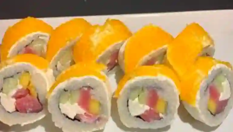 Roll con pollo apanado, queso crema y mango, envuelto en queso crema.