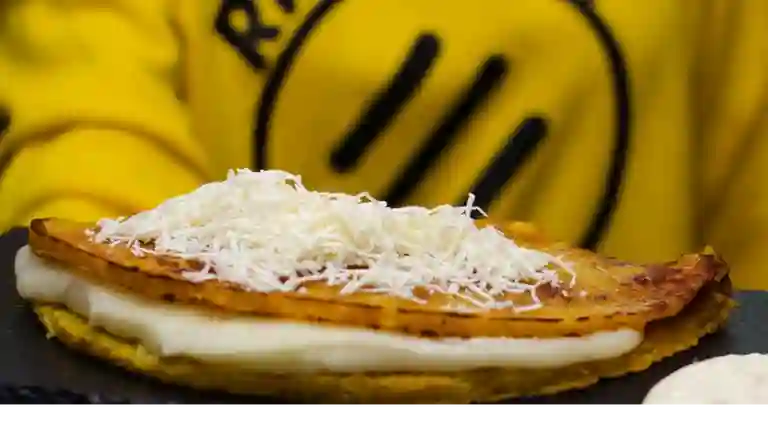 Cachapa con mantequilla, mechada, queso de mano, queso llanero y nata.