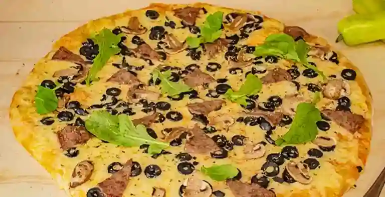 Pizza con salsa de tomate, queso, orégano, tomate, jamón, aceituna y tamaño a elegir.