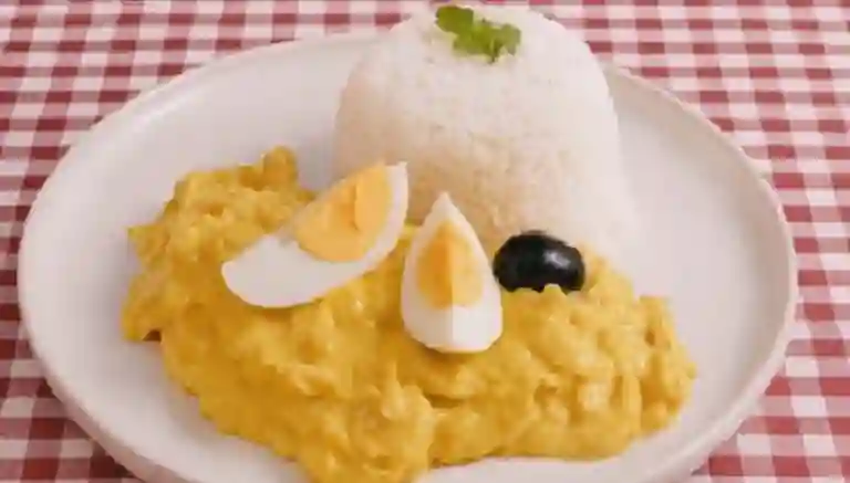 Ají de gallina con pollo deshilachado en salsa de ají, acompañado de arroz blanco, papa frita, huevo duro y aceituna.