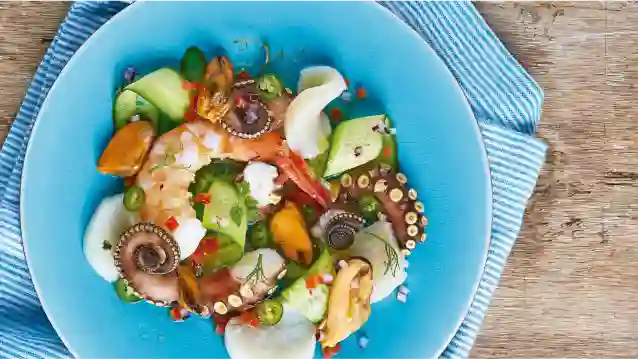 Ceviche de salmón, pulpo, leche de tigre, jugo de limón, cebolla morada, palta, camote, choclo peruano y cilantro.