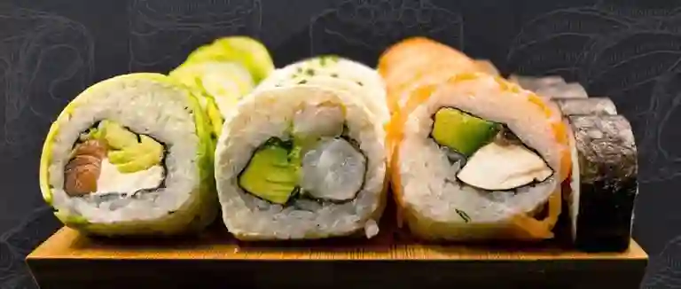 10 Rolls de pepino, palmito, palta, pimentón, queso crema y cebollín.
