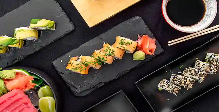 Base de arroz, salmón, atún, camaron, palta, cebollín y sésamo..