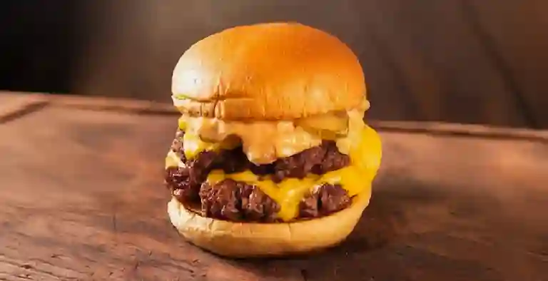 Hamburguesa doble smashburger fresca de 110 gr, queso americano 4 pzas, cebolla picada y pepinillos.