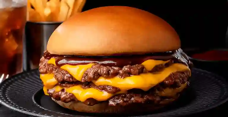 Hamburguesa de la casa con queso gouda, salsa de queso cheddar, tocino, lechuga y tomate.