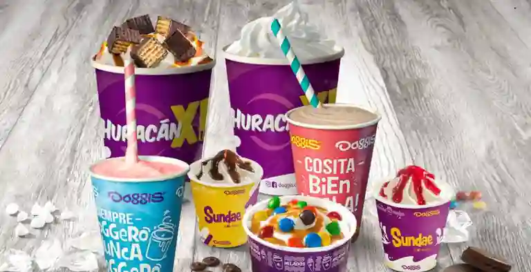 Helado huracán (vainilla, chocolate ó mixto) con salsa (frutilla, manjar ó chocolate) y topping de gomitas de gelatina en forma de delfines.