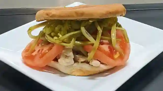 Sándwich con carne vacuno, tomate, poroto verde, mayonesa, ají y pan frica