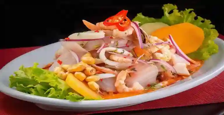 Pescado fresco marinado en limón de pica, servido con cebolla y choclo peruano.