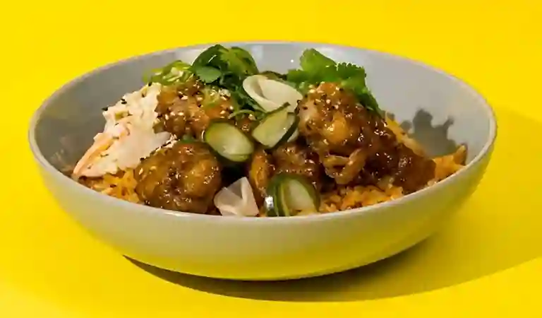 Pollo frito, acompañado de arroz salteado con kimchi, asian slaw y lactonesa de gochujang.