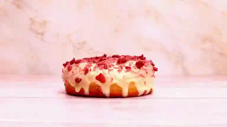 Donut rellena de frutilla y glaseado dulce-acido con chispas.recuerda que todos nuestros productos son tamaño xl y premium. donuts artesanales y sin preservantes.