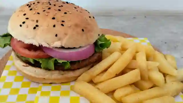 Carne, tomate, cebolla, lechuga, ketchup, mostaza, mayo acompañada de papas fritas.