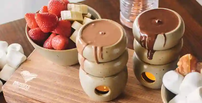Prepara tu fondue Brussels en casa. Incluye una vela y 100 gramos de chocolate para derretir.