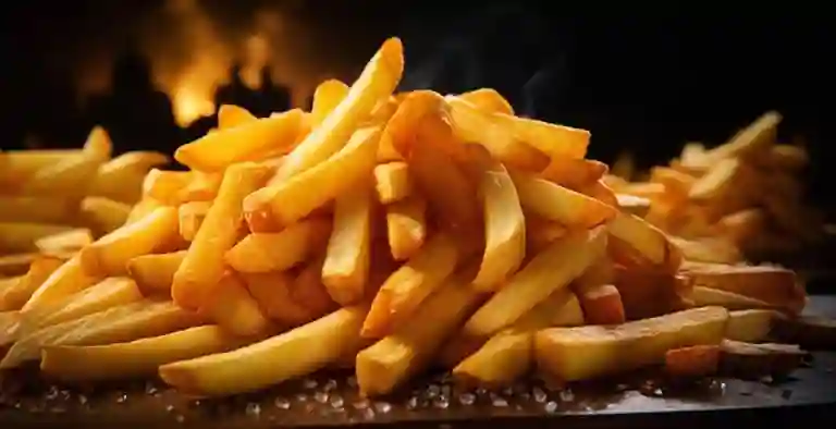 Papas fritas con camarones salteados y salsa bisquet de la casa.