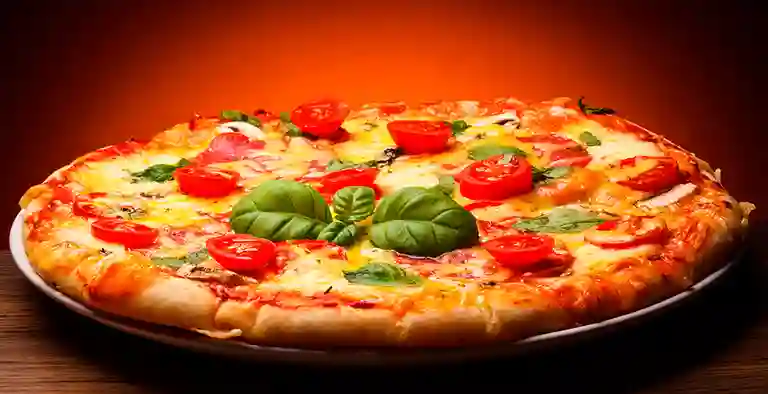Pizza mediana cubierta de salsa pomodoro, queso tipo mozzarella, jamón, tomate picado y orégano.