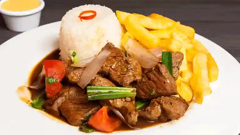 Trozos de lomo fino salteado con gajos de cebolla y tomate acompañado de papas fritas y arroz.