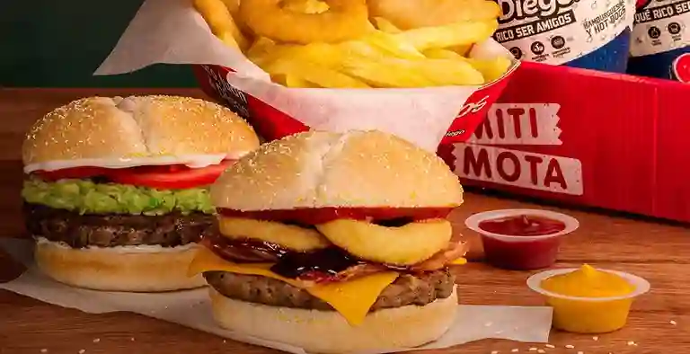 2 Hamburguesas criollas normales, más 2 papa frita mediana y 6 empanadas.