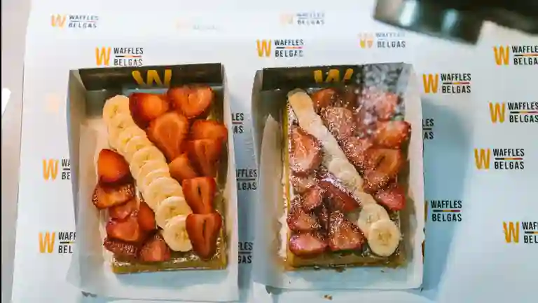 Waffle con frutilla, plátano, chocolate belga derretido y azúcar flor.