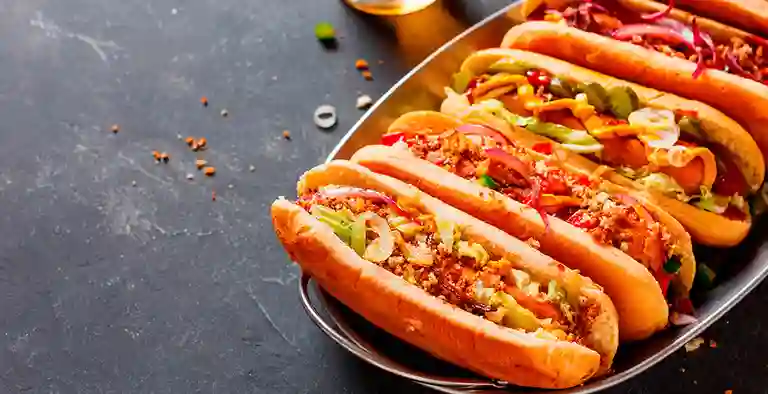 Hot dog con vienesa, queso, palta y cebolla crispy.