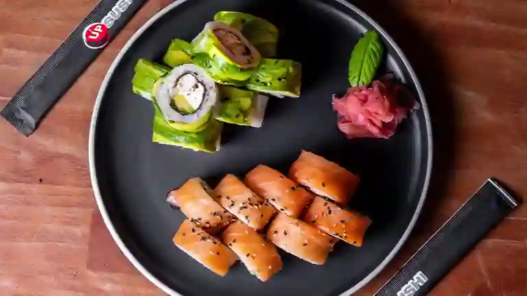 1 roll hot: salmón, choclo y queso crema. 1 roll hot: kanikama y queso crema. 1 roll frio envoltura sésamo: camarón, palta y queso crema. 1 roll frio envoltura jamón serrano: pollo, cebollín y queso.
